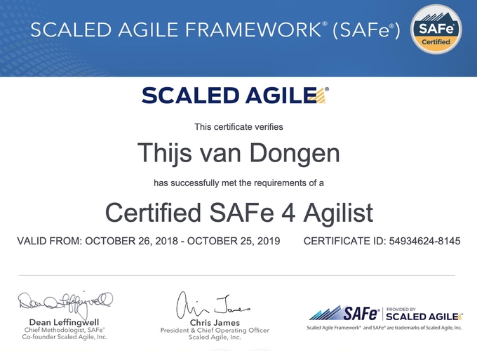 De opleiding was zeer interessant. Meestal ligt het accent bij agile op het werkne met scrumteams met een product owner en scrummaster. Die kunnen per sprint bepalen wat er wordt opgeleverd. Bij Safe agile kom meer het bedrijfsbelang naar voren. Tactisch en strategisch is hoe de Safe Agile de releases bepaald. Voor mij een heel belangrijk aspect omdat dan tenminste de juiste zaken op het juiste moment voor een organisatie wordt ontwikkeld.